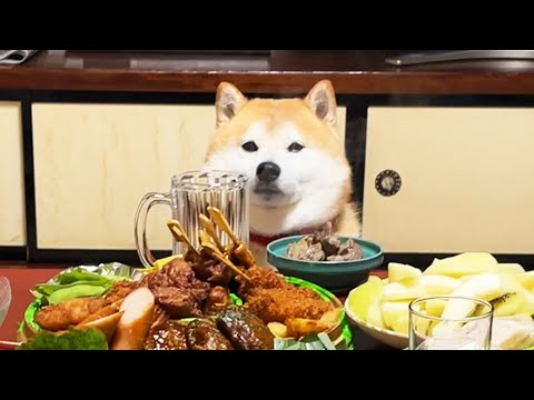 お正月の宴会で家族の誰よりも早くお誕生日席でスタンバイしている柴犬