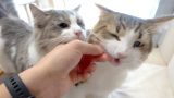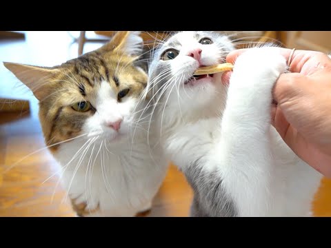 アニキのおやつを奪い取ろうとする生意気な子猫