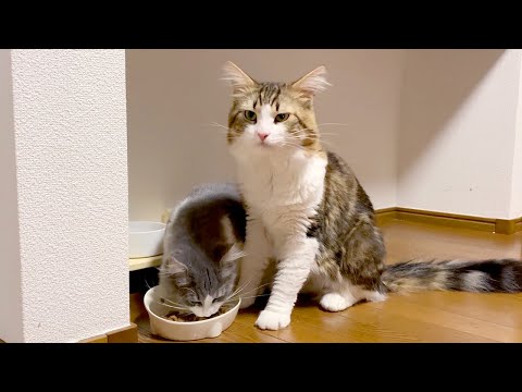 エサを横取りする子猫に対して兄猫の反応が優しすぎる…