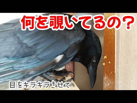 【何が見えるの?】カラスが隙間から目を輝かせてずっと謎の行動をしています 20220804、カラス&四つ足カルテット