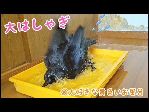 【大はしゃぎ】カラスの大好きな 黄色いお風呂で このはしゃぎようですw 20220329、カラス&四つ足カルテット