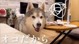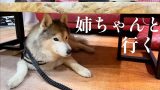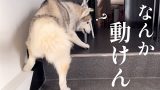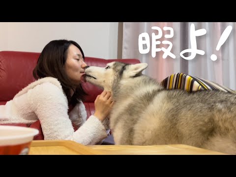 ソファを陣取って勉強する姉にかまちょした後、隣ですっぽりおねんねするシベリアンハスキー