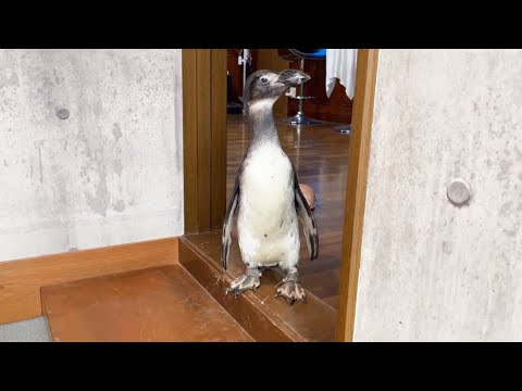 ママが帰ってくるまで玄関前でじっと待つペンギン