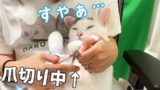 ママの上が好きすぎて動かないサビ猫モモちゃん