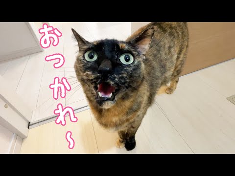 ママの朝の家事を見守ってくれるサビ猫モモちゃん!