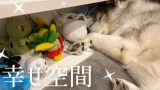 両膝を平等に気遣うシベリアンハスキー