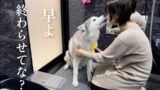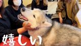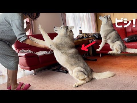 今年最後の苺を持つママの前で姿勢良く「気をつけ!」を披露するシベリアンハスキー