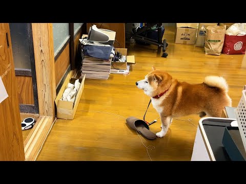会社のお客さんとの打ち合わせにスリッパ係として参加しようとする柴犬