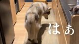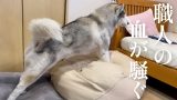 兄の外出を見逃さずに、すかさず玄関へ追いかけるシベリアンハスキー