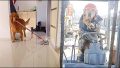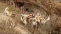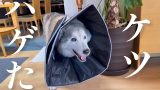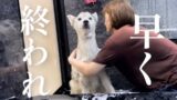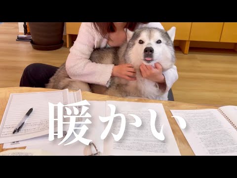 勉強中の姉のお膝の上で抱っこされ、満更でもないシベリアンハスキー、兄によって顔をベタベタにされる。