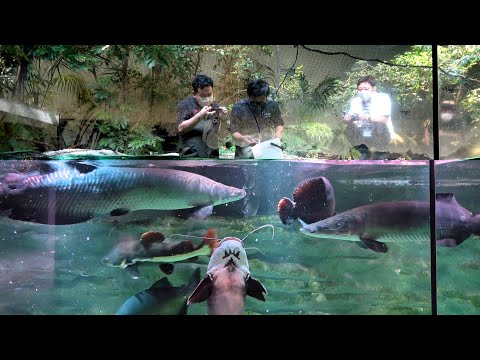 大量の巨大魚を飼育する水族館のお世話ルーティン