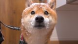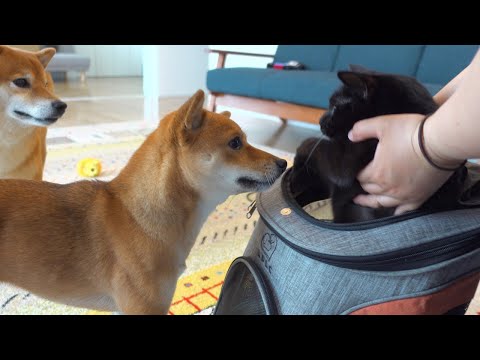 子猫の散歩の練習を、それぞれの形で心配する柴犬の姉と兄。