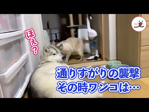 寝てただけなのに思わぬ襲撃に遭うワンコ