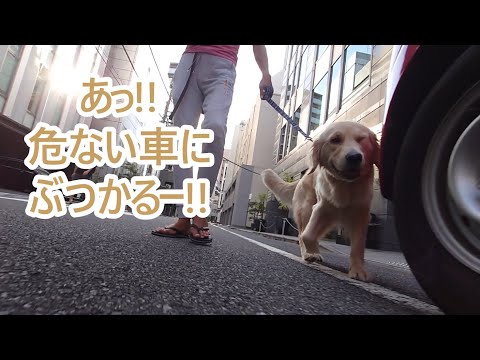 散歩中!あーっ!駐車禁止場所に車停められるとぶつかっちゃうよー!ゴールデンレトリバーティト。