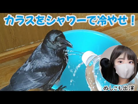 【カラスのシャワータイム】暑すぎるのでカラスをシャワーで冷却しました 20220702、カラス&四つ足カルテット