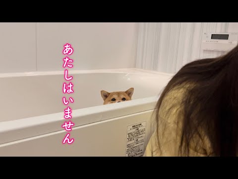 洗われたくないから静かに風呂桶に身を潜めて隠れてる柴犬が可愛い