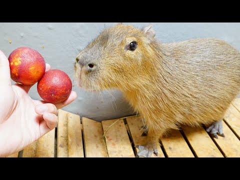 真っ赤なみかんを不審がるカピバラ、果たして食べてくれるのか?