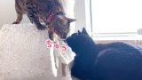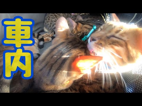 移動の車内でお互い励まし合う父と息子猫