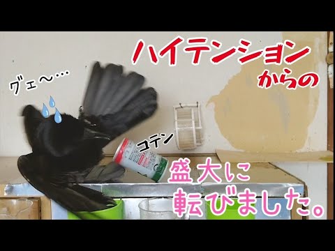 【カラス転ぶ】缶と戯れていたカラスがこのようにまっ逆さまとなりましたw 20220708、カラス&四つ足カルテット