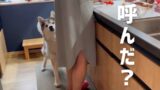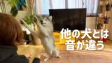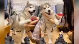 美味しいリンゴが嬉しくて、机にまでおててを乗せちゃうシベリアンハスキー