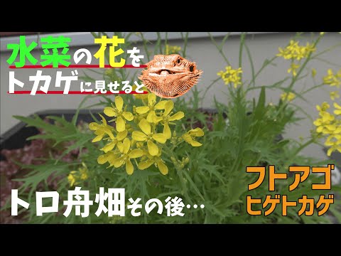 【フトアゴヒゲトカゲ】自家栽培の水菜に花が咲いたのでフトアゴにプレゼントする