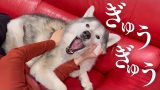 雨降りし極寒散歩から帰宅し、散歩後ルーティンでもちむちょにされるシベリアンハスキー