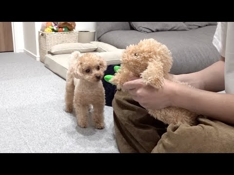 靴を履かされた相棒が心配で様子を見にくるトイプードル