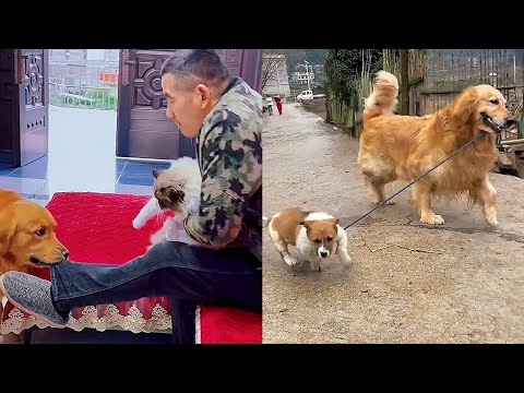 Golden retriever angry because owner likes cats????Funny dog steals back a puppy????
