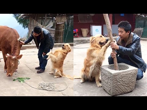 Golden Retriever - Dog AwesomeGolden Retriever herding cattle and feeding pigs on the farm????Dog and owner play together????