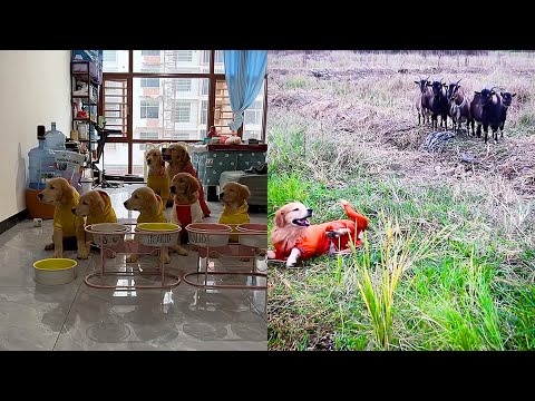 Golden retriever performing dance for goat????Funny dog and goose play????