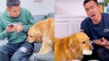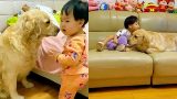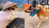 Golden retriever performing stunts outdoors????Puppies and birds play together☺