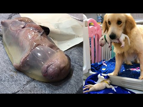 Golden retriever puppies in amniotic fluid???? The dog carries its newborn puppies???? Cute Dog