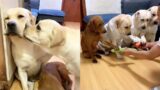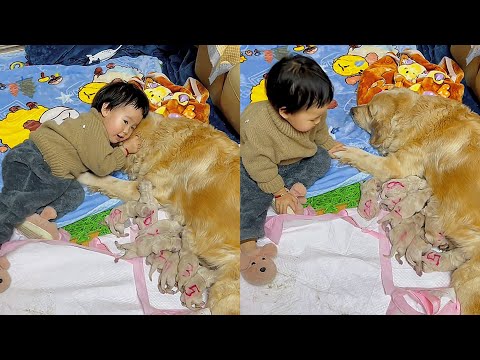 Golden Retrievers always protect their children????Cute puppy come to the world????