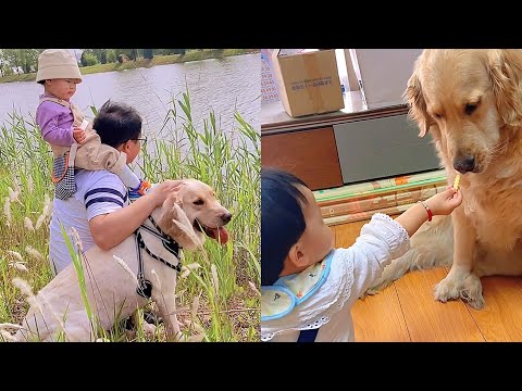 Happy life of golden retriever with family????Child imitates father kissing golden retriever????