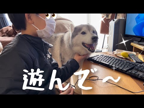 PCを触る従兄弟のチビっ子と遊びたくて横から妨害行為を繰り返すシベリアンハスキー